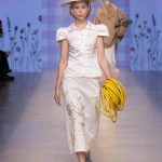 Аксессуары — от мини-зонтиков и шляп до ироничных деталей вроде леек и садовых шлангов — подчеркивают театральность и индивидуальность стиля. Цветовая палитра сочетает сдержанную базу и яркие акценты, фактуры варьируются от плотных до лёгких.