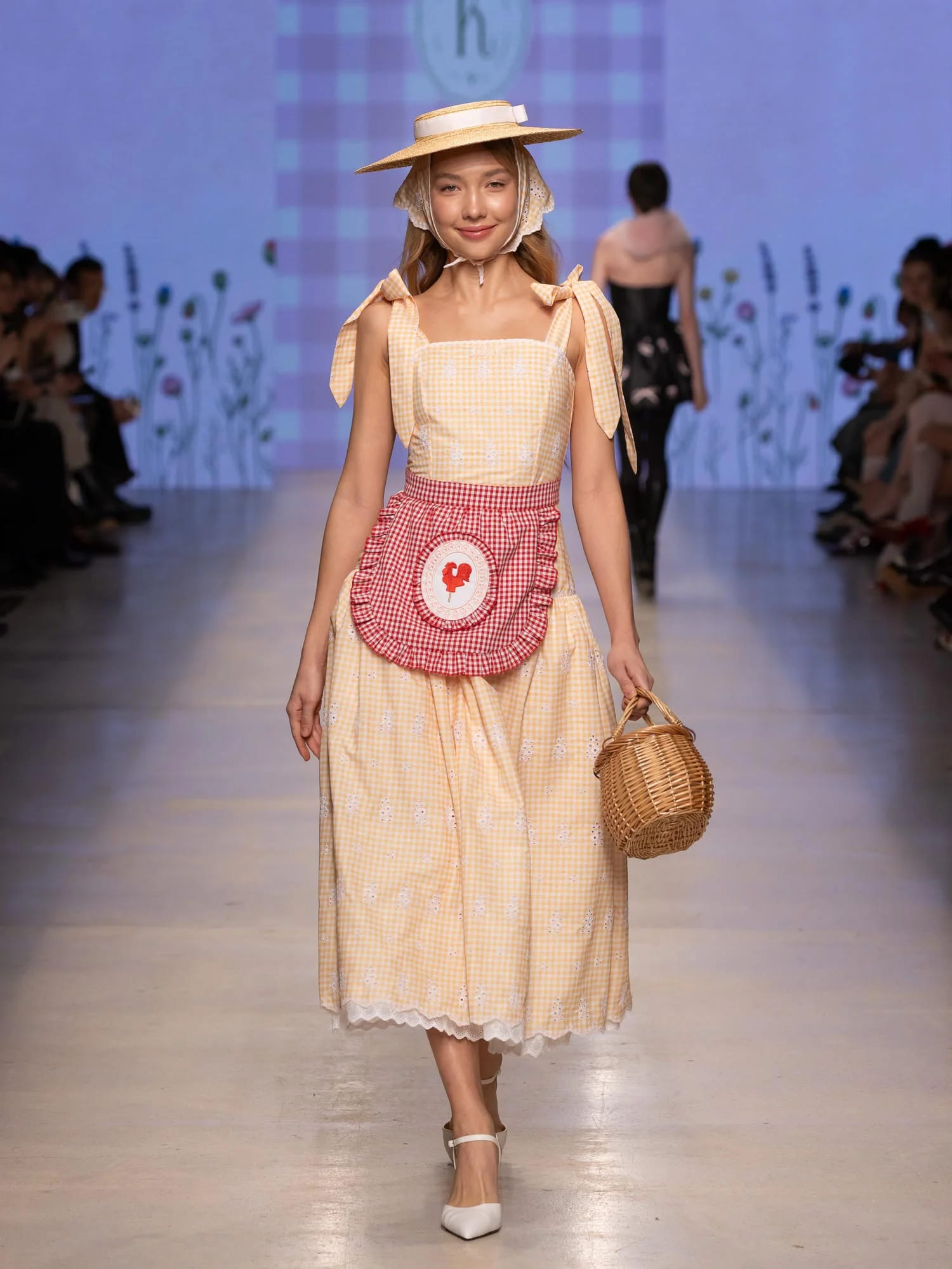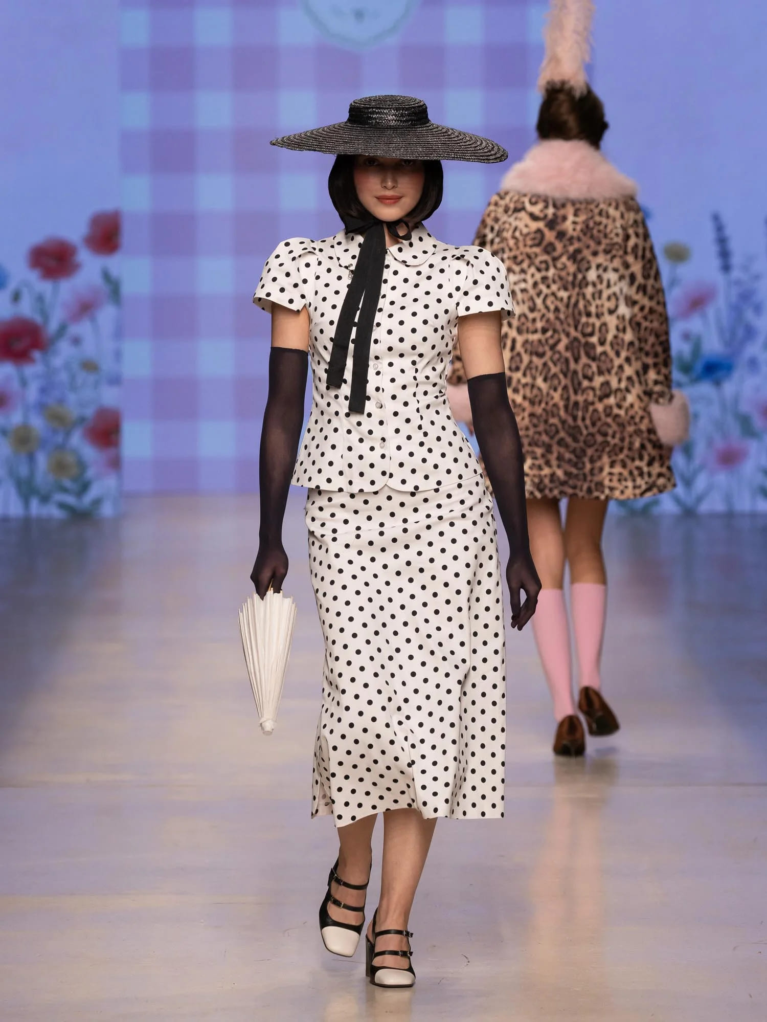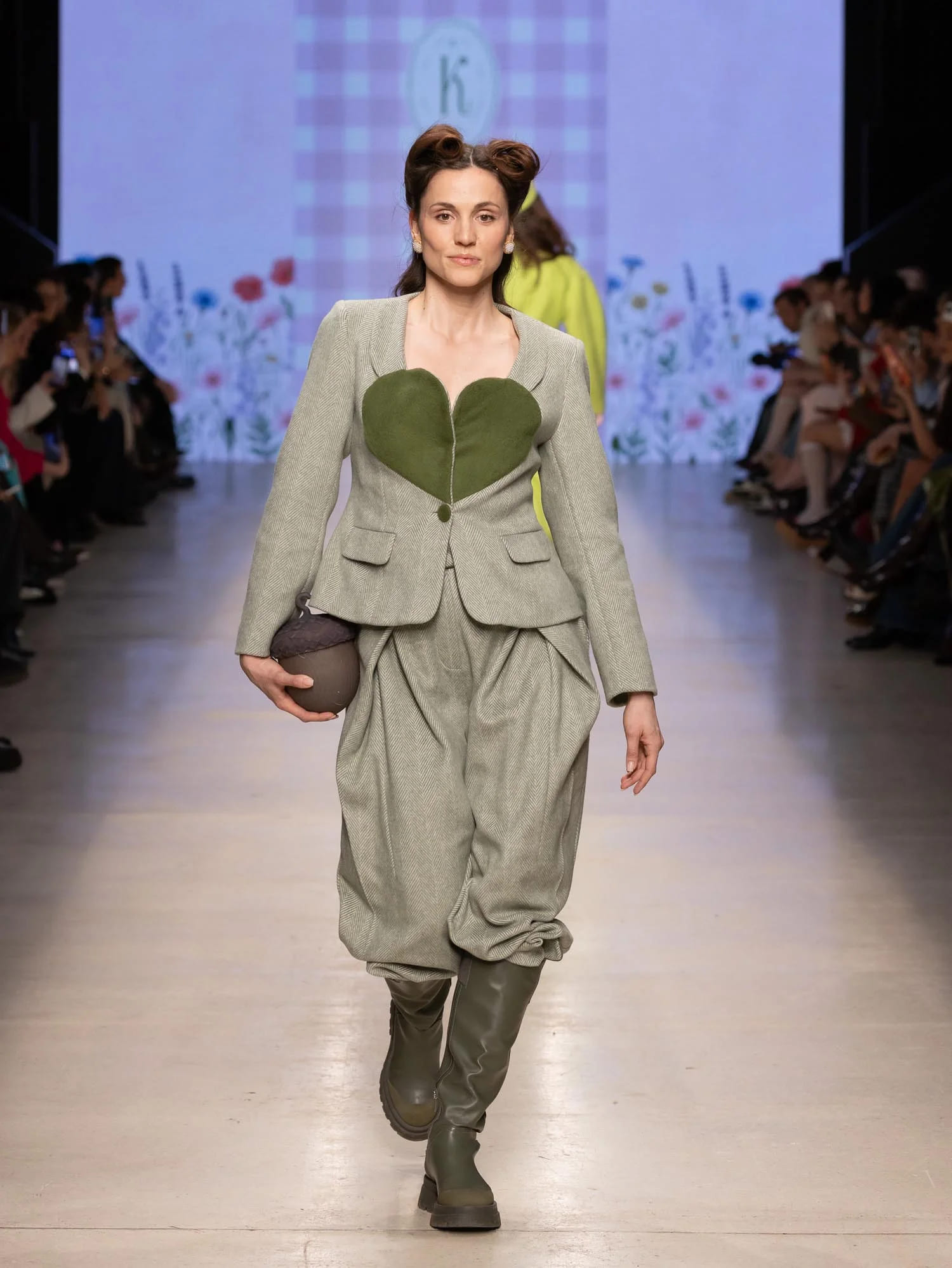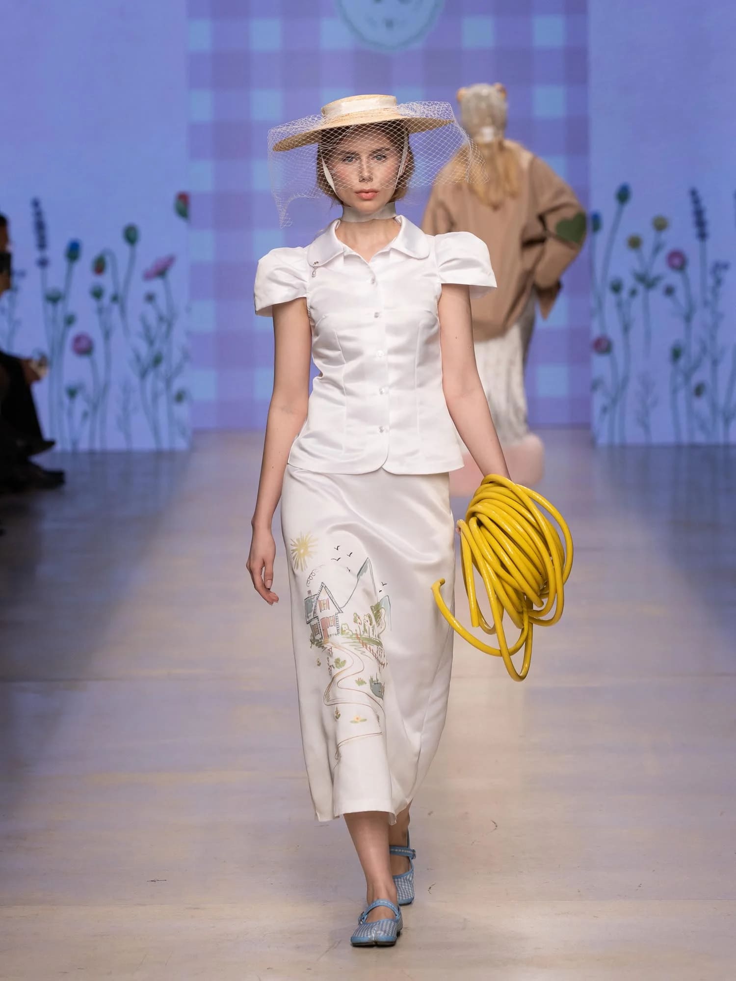 Аксессуары — от мини-зонтиков и шляп до ироничных деталей вроде леек и садовых шлангов — подчеркивают театральность и индивидуальность стиля. Цветовая палитра сочетает сдержанную базу и яркие акценты, фактуры варьируются от плотных до лёгких.