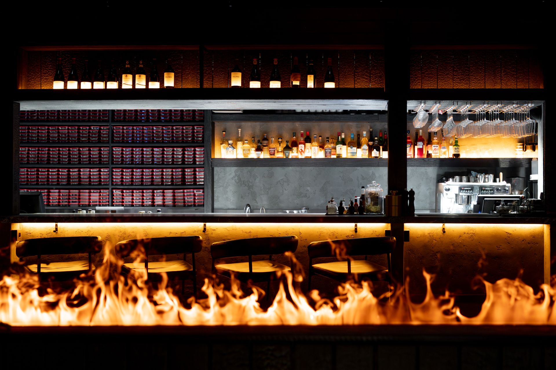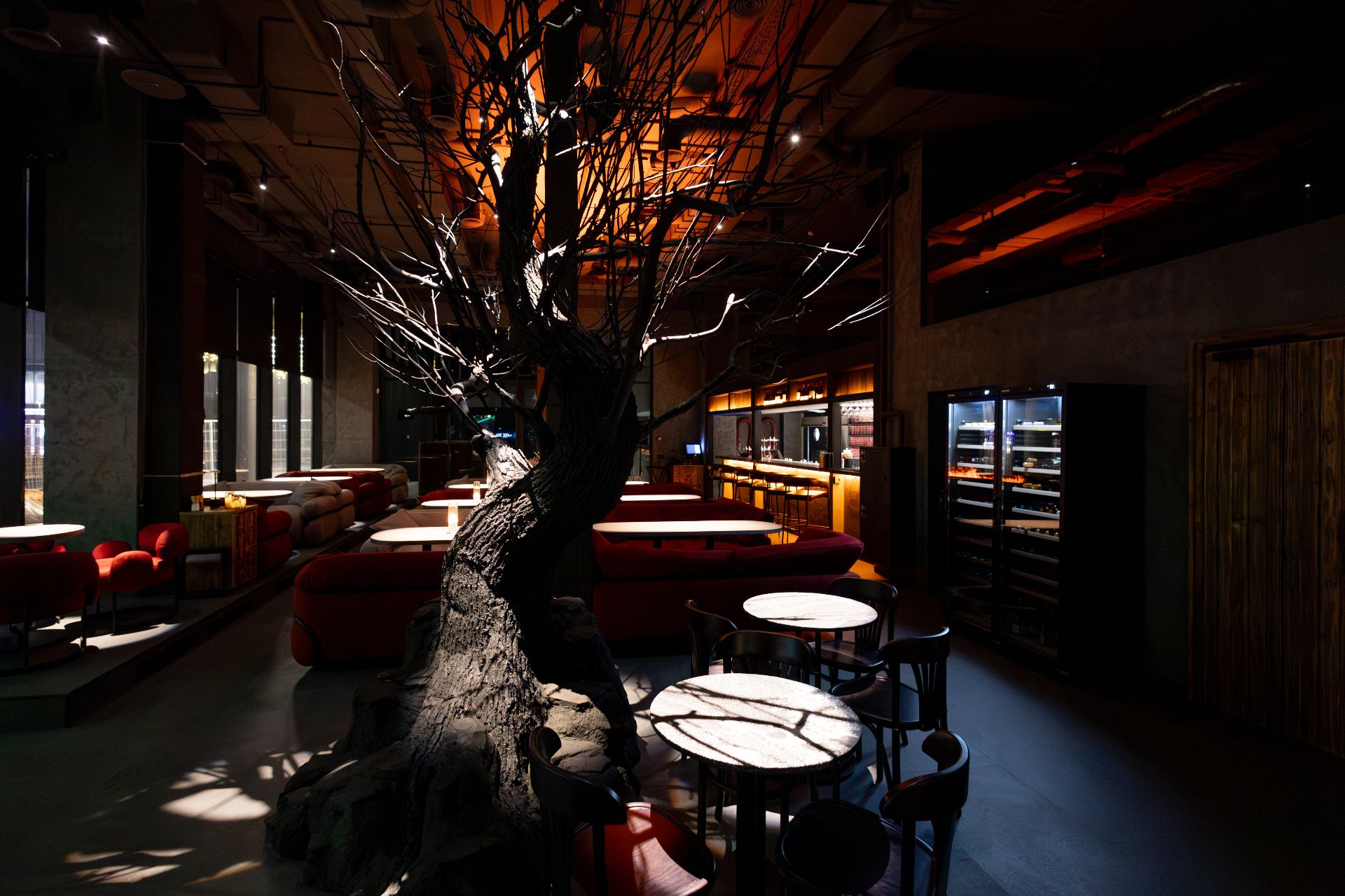 Камерная атмосфера igni отражает внутренний мир человека, в который никто не может вторгнуться. Здесь выполнено световое зонирование. В центре зала — сгоревшее дерево, тянущееся к лучам света, как олицетворение стойкости и незыблемости. Интерьер оформлен в выгоревших тонах, двери и мебель собраны вручную из остатков старинной мельницы. Обстановка в баре и центральная перегородка — также из сгоревшего дерева, на поверхности которого горит огонь, символизирующий дух названия igni.