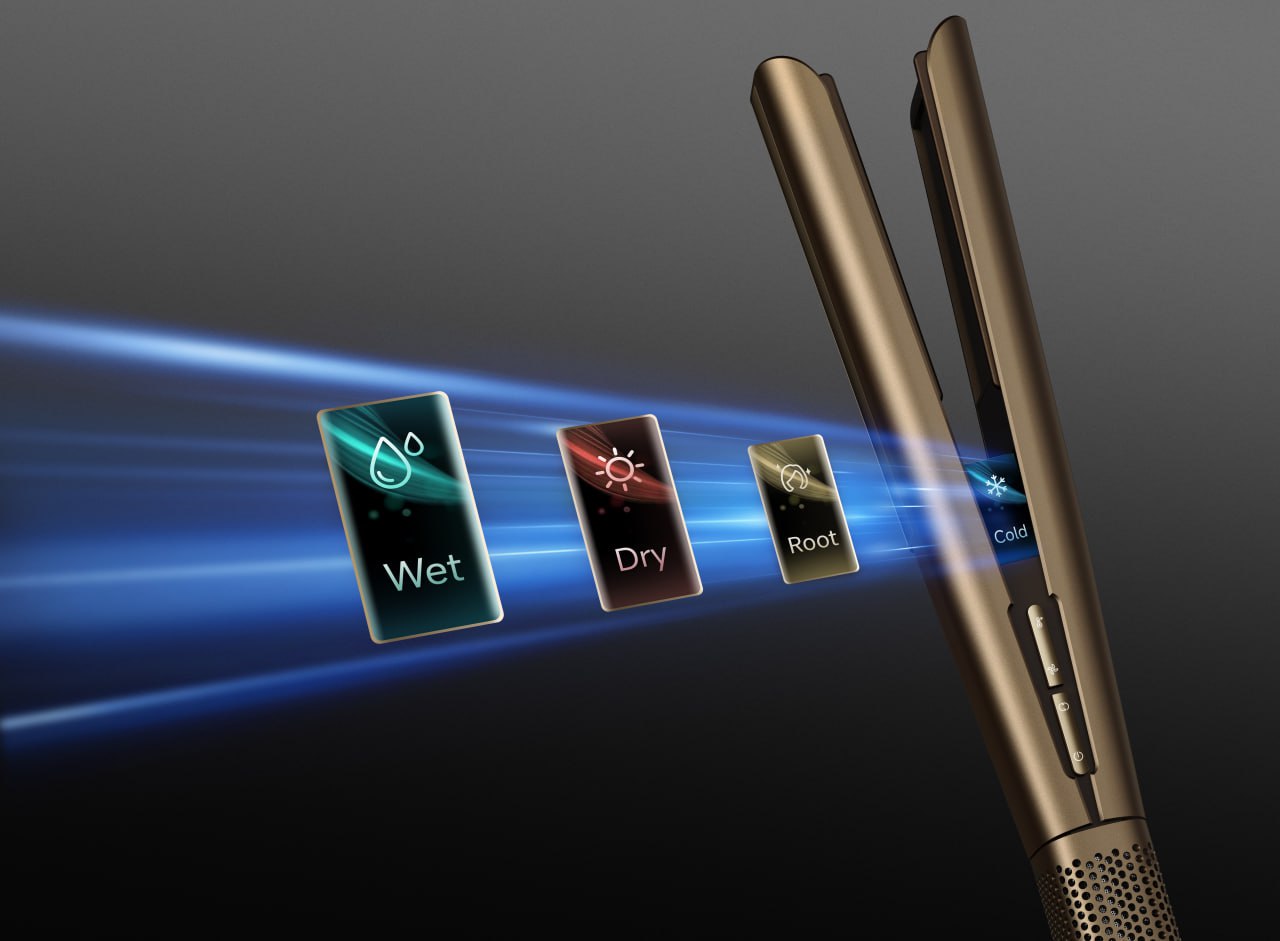 Более того, в Aero Straight доступны три режима: сушка корней, выпрямление влажных волос, укладка сухих. А ещё можно подобрать комфортную температуру под разные сценарии использования, при этом датчик NTC, который делает 300 измерений в секунду, не даст перегреться вашим волосам.