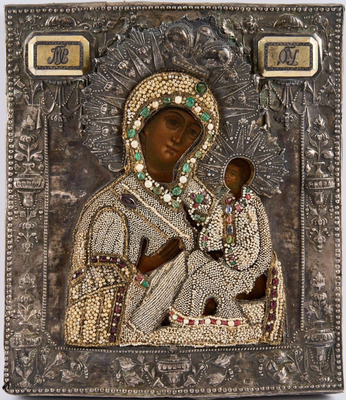 Одежды Богоматери и Младенца расшиты жемчугом — символом девства и божественной чистоты. Эксперты называют этот лот произведением музейного уровня, сохранившим синкретическое единство живописи и драгоценного убранства.