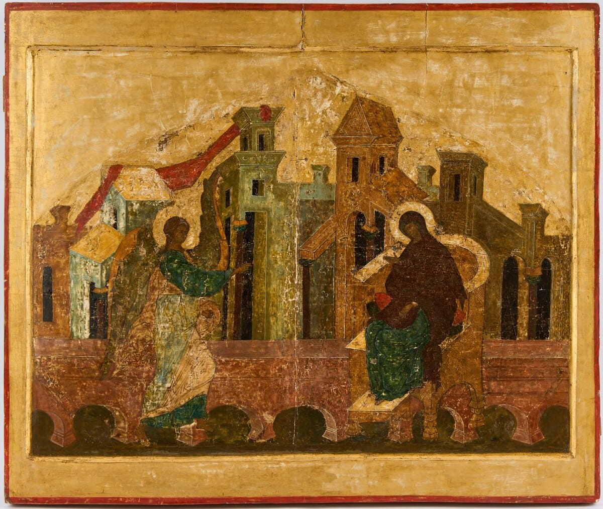 Композиция построена по фризовому принципу с большим количеством архитектурных деталей, при этом пространство сцены оставляет место для выразительного диалога архангела Гавриила и Девы Марии. По мнению специалистов, этот лот представляет особый интерес для коллекционеров, связанных с традицией рублёвского круга.